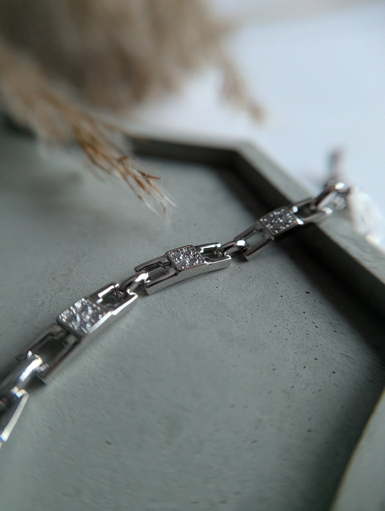 Un bracelet argenté au design géométrique, composé de maillons carrés délicatement sertis d’éclats lumineux. Son style moderne et structuré apporte une touche chic et intemporelle à votre poignet.