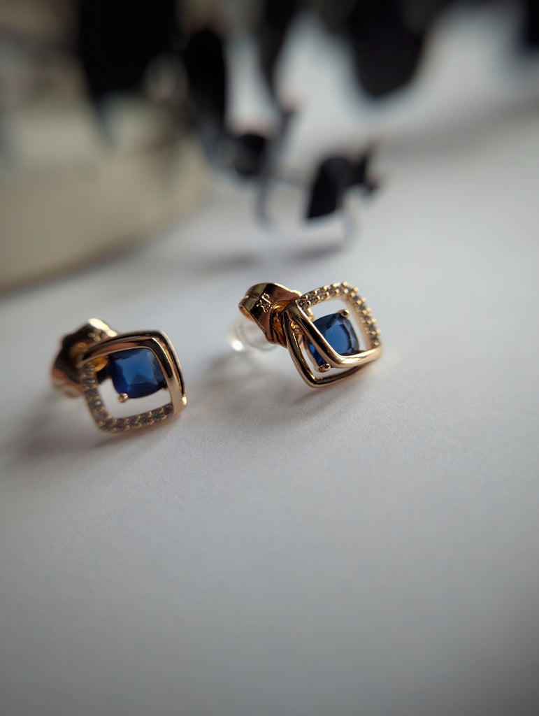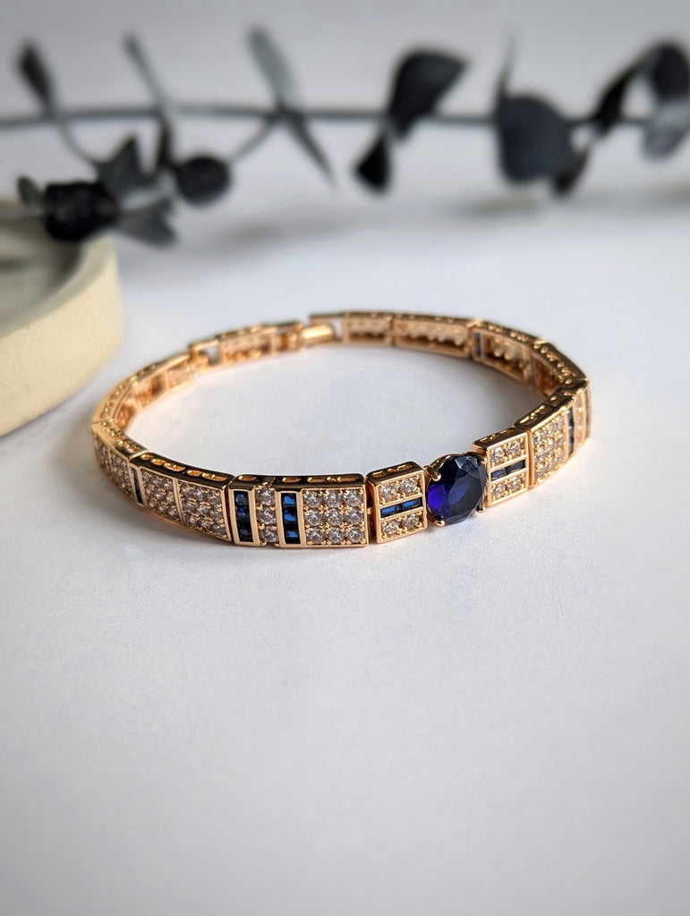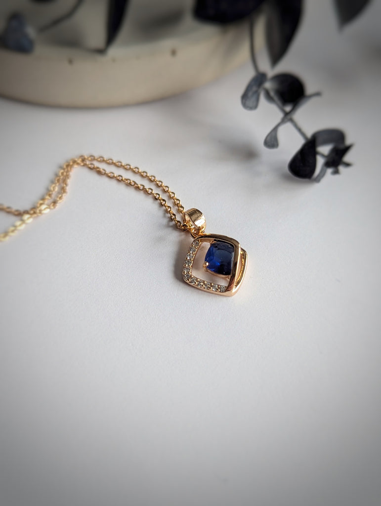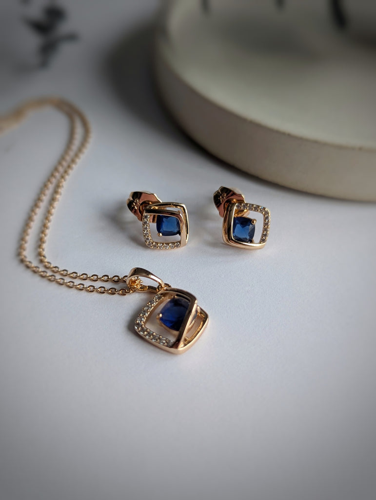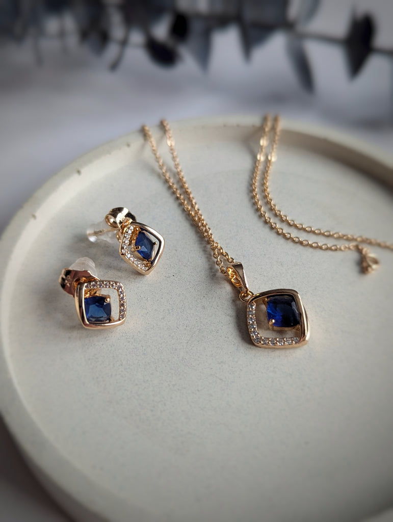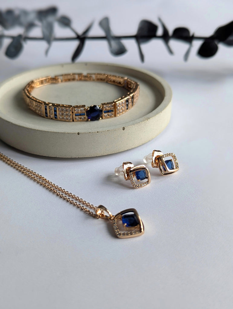 ✨ Ensemble doré avec pierre bleu saphir : collier ,boucles d’oreilles et bracelet élégants, ornés d’un cristal bleu profond et d’un contour scintillant. Parfait pour ajouter une touche de raffinement.✨